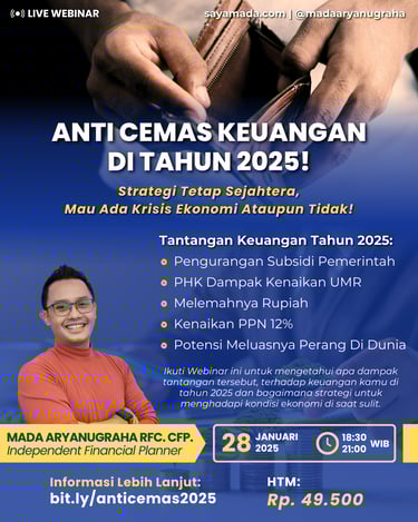 Webinar ini diadakan dengan tujuan untuk membantu kamu memahami dan mengetahui apa saja tantangan keuangan yang akan terjadi di tahun 2025 dan bagaimana cara menghadapi tantangan tersebut sehingga kamu akan lebih siap secara mental dan dapat terhindar dari kondisi kesulitan keuangan.